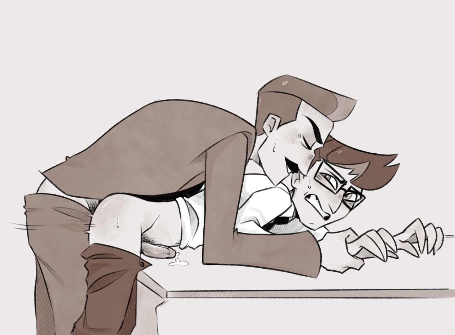bent over table